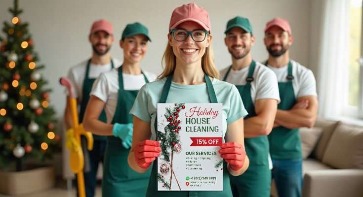 Focus house cleaning seasonal flyers on affluent residential neighborhoods, busy professional areas, and family-oriented communities. Target areas with higher home values where residents frequently entertain and value convenience during holiday seasons. - How can I make my cleaning flyers stand out from competitors?